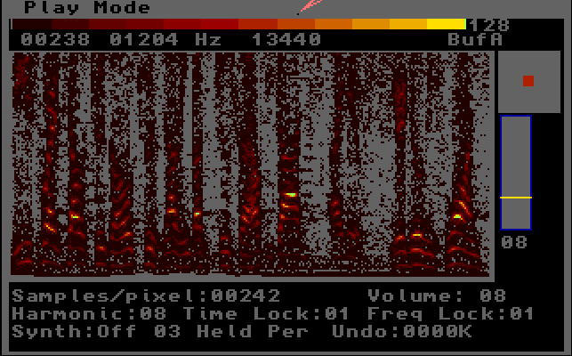 The painting tools in RGS are different from the ones used in other computer paint programs, because time is different from frequency. The tools are more horizontally oriented, in order to put correlated sound into time. There are special tools which draw harmonics -- lines equally spaced in frequency - and also to erase everything BUT harmonics from a complex sonogram. There are time and frequency constraints which let you build rhythms (constrained time) and very pure harmonic material (constrained frequency). RGS can analyze a sound sample into its sonogram as well, which you are then free to edit and resynthesize. You can save out the synthesized sample (in Amiga's IFF 8SVX format) for use by other programs.