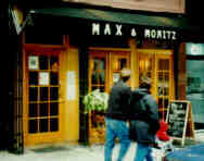 426-A 7th Avenue (between 14th and 15th Sts., Brooklyn, 11215 (Park Slope). (718) 499-5557. F to 7th Avenue; or N/R to 9th St. to see the neighborhood, or N/R to Prospect Ave. to see the boonies. Food: Service: Food coma: Paul Goebert's Austrian bistro is all the rage in Park Slope for its fine yet affordable dinners. The brightly painted and pleasantly noisy room feels busy yet intimate. Patrons are a neighborhood mix of casually dressed couples, pairs of couples, and young families. In the fall of 1997, Max's talent at pairing great food with poor brunch service, both in kitchen pacing and among the tables, gave birth to these reviews, to this mission to find the perfect eggs Benedict experience. Four years later, the service has improved tremendously, aside from slow plate-clearing. Brunch comes with good coffee, served hot and refreshed often, and with some sourdough rolls and butter. The $4, medium-size mimosas use pulpless fresh juice from cartons, but they are very cold and have a lot of usually excellent champagne. The $4, small bloody Mary is not spicy but has the pleasant and complex blend of spices that evoke a hint of clam juice. Appetizers are tasty. Steamed mussels in peppery, asparagus-and-fennel broth are delicious. On my most recent visit, the $8.50 eggs Benedict was almost excellent -- English muffins well toasted on the grill, lightly grilled Canadian bacon, well-poached eggs, and lots of lemony and buttery hollandaise blanketed with parsley. The grilled half of a large plum tomato was a colorful and flavorful transition between the fattier food on the plate and the viniagrette-tossed salad greens. A $2.50 side dish of bacon was hot and cooked perfectly between chewy and crunchy. But a charbroiled-burger flavor from an apparently undercleaned grill marred the muffins, Canadian bacon, and strip bacon. I love charbroiled burgers, and Max & Moritz doesn't even offer then, but that's a lunch taste, not a brunch taste. Rest rooms: Two phone-both-size, dim, single-seater rest rooms. |