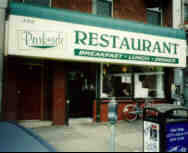 355 Flatbush Avenue (between Sterling Pl. and Prospect Pl.), Brooklyn 11238 (Park Slope/Prospect Heights). (718) 636-1190; 636-4068. D/Q to 7th Avenue, 2/3 to Grand Army Plaza. Food: Service: Food coma: You don't expect good eggs Benedict from a diner. Diners do better to offer more basic brunch fare. But Parkside Diner falls flat in trying to offer anything. Seating for seven was difficult, as the small space is unsuited to parties greater than four. Menus must be scarce, as the waiter took some of ours back before we'd even ordered. Orange juice (not fresh but large) and coffee were slow to arrive. Parkside's $5.75 eggs Benedict had tasty poached eggs that were hot, if runny, but the hollandaise was a grainy, congealed mess reconstituted from some powder. Eggs Benedict is usually offered only on weekends because the sauce is difficult to prepare and keep fresh. For Parkside to serve that sludge only on weekends is pretentious, yet merciful. The rest of the entrée was little better. The toasted English muffin halves were burnt at the edges yet still soft at the centers. The Canadian bacon had been grilled but was flavorless, and the home fries were tasteless and oily. Few other dishes impressed. Scrambled eggs ($2.75) were nicely fluffy and waffles ($3.50) were judged excellent, and a sausage-and-mozzarella omlette ($4.75) with a side of tomato sauce was called "odd but good," if small. But French toast ($3.45) was painted a violent orange. Side orders of bacon ($1.60) were overcooked, blackened fragments sadly scattered on big plates, and looked so oily I wanted to pad them with an napkin first, like slices of pizza. The one burger ordered was greasy without and dry within. French fries ($3.35) were mealy, probably previously frozen.Why even sit down? Walk a block uphill to New Prospect Café instead. Rest rooms: Small but clean.Handicapped accessibility: A large step up from the street, with two turns to get in. No space in the aisles. Rest rooms have wide doors but, being down a narrow hall, can't be reached. |